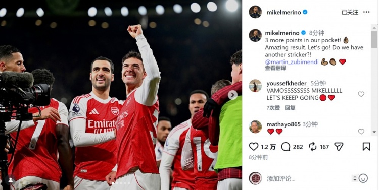 阿森纳中场梅里诺社媒晒出与进球元勋苏维门迪一齐庆祝的相片,配文:“咱们又成绩3分!很棒的成果,不竭加油!”