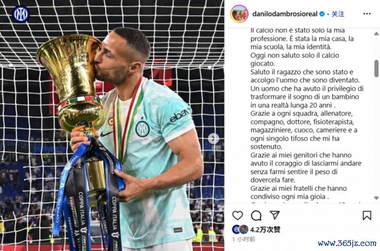 8月30日讯 本日,国米旧将丹布罗西奥在个东谈主Ins上发表长文,晓喻退役。