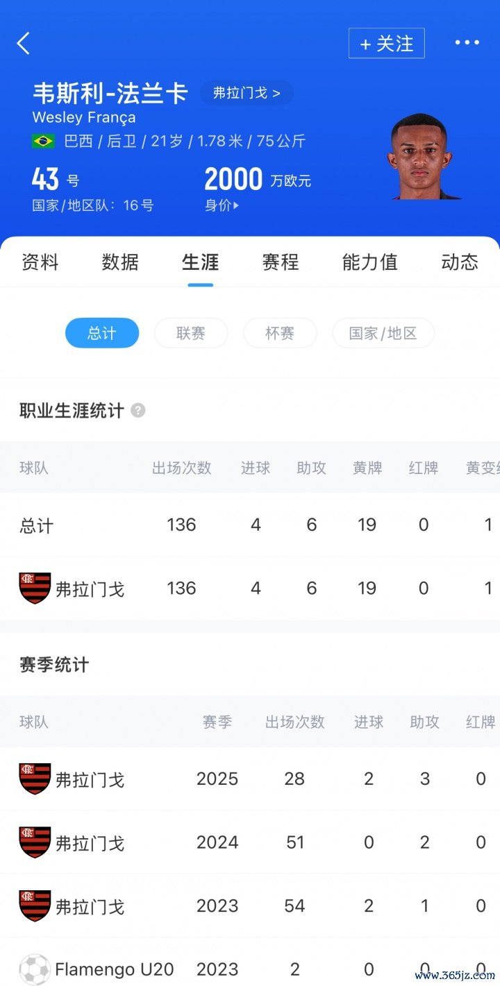 21岁的韦斯利司职右后卫,本赛季为弗拉门戈28场孝顺2球3助攻,德回身价2000万欧元。