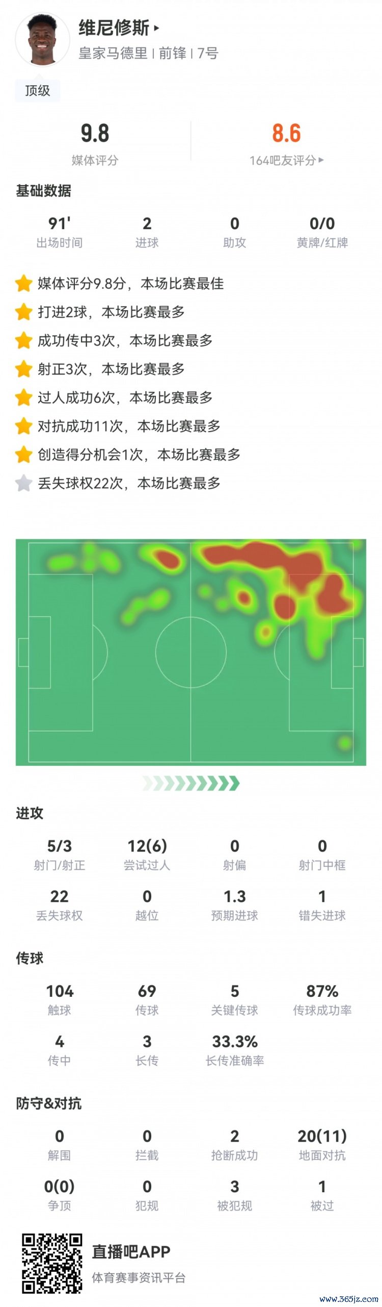 10月5日讯 本轮西甲,皇马3-1黄潜。此役维尼修斯首发打满全场,球员全场要点数据如下↓