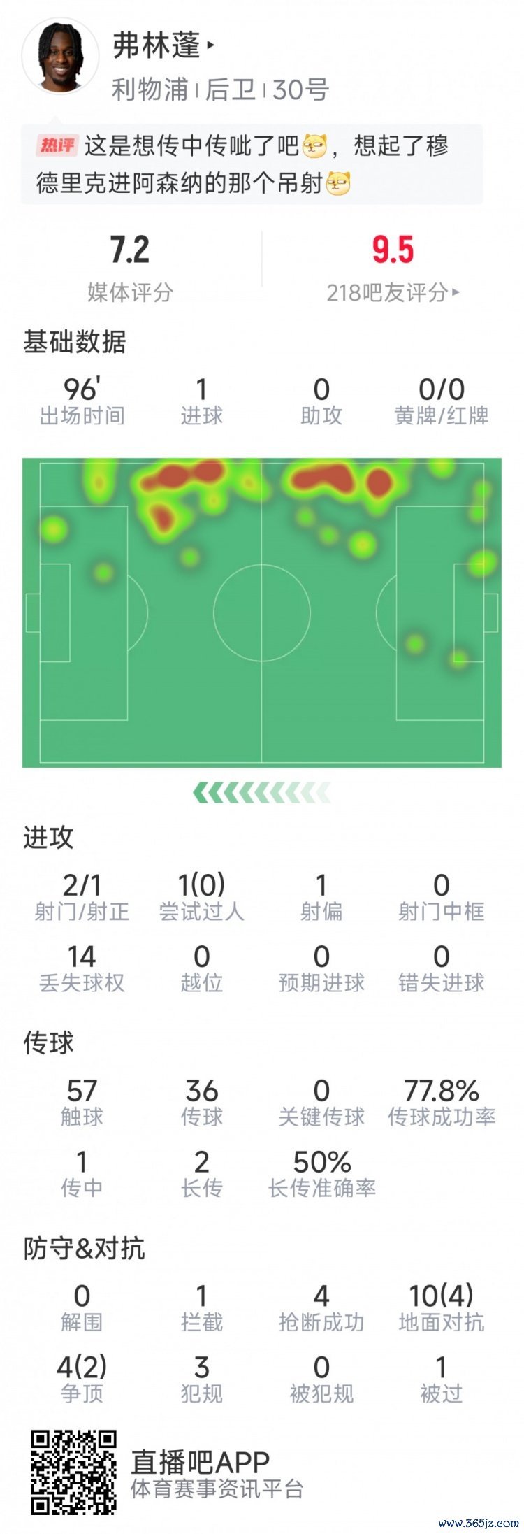 8月11日讯 在社区盾杯决赛,利物浦2-2战平水晶宫,两边插足点球大战,本场新援弗林蓬打进一球,以下为他在本次数据: