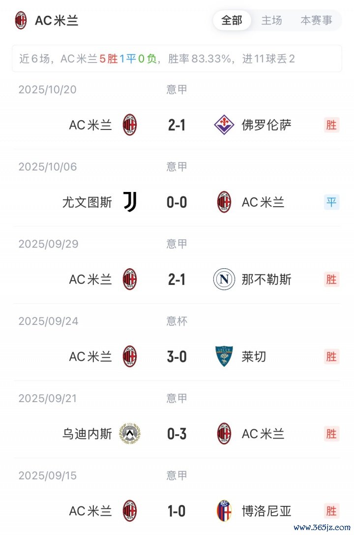 米兰5胜1平1负暂以16分领跑意甲,比萨3平4负名次垫底。