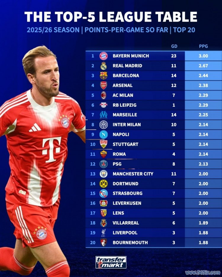 10月25日讯 《转会阛阓》统计了本赛季五大联赛球队的场均拿分情况,拜仁、皇马、巴萨、阿森纳分列前四。