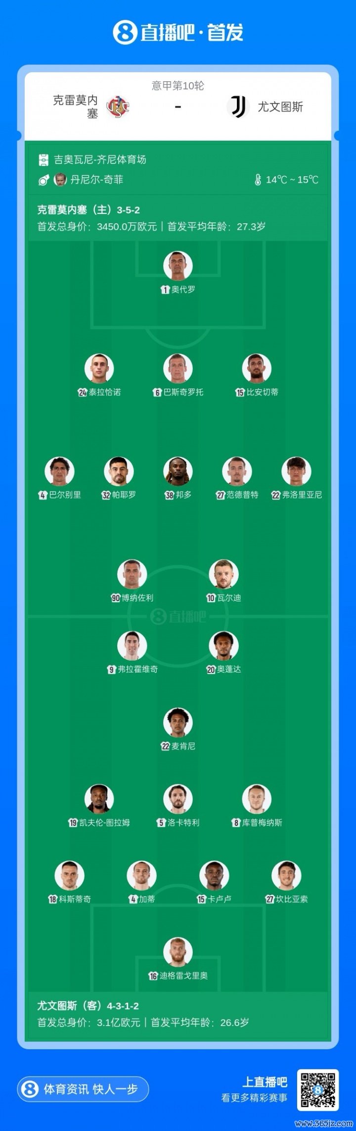 11月2日讯 意甲第10轮,克雷莫内塞主场迎战尤文比赛行将打响。赛前首发出炉。