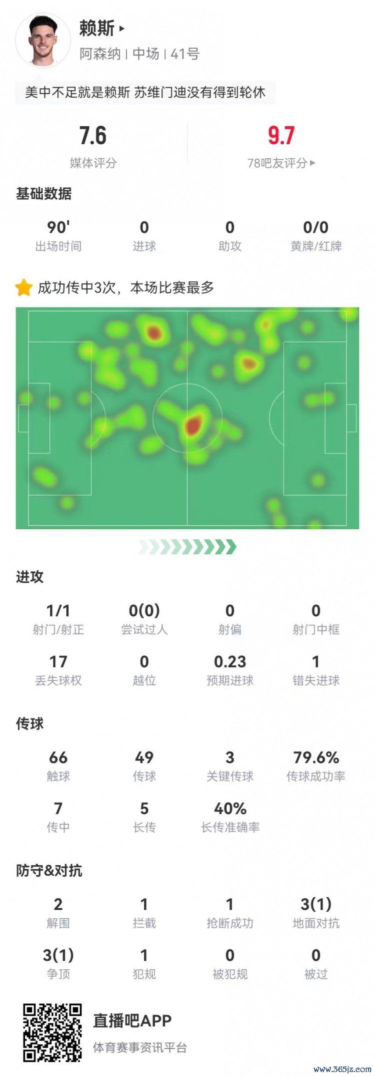 11月27日讯 阿森纳在本轮欧冠镇守主场3-1力克拜仁,赖斯本场数据如下: