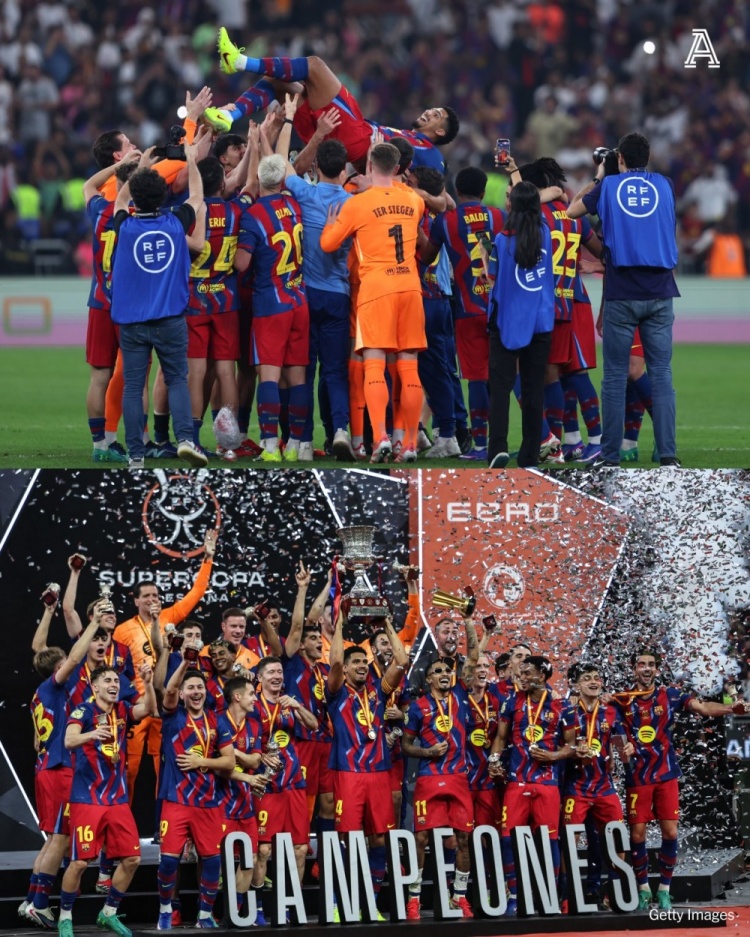 1月12日讯 西超杯决赛,巴萨3-2驯顺皇马。据The Athletic报说念,阿劳霍在赛后被队友抛起庆祝。