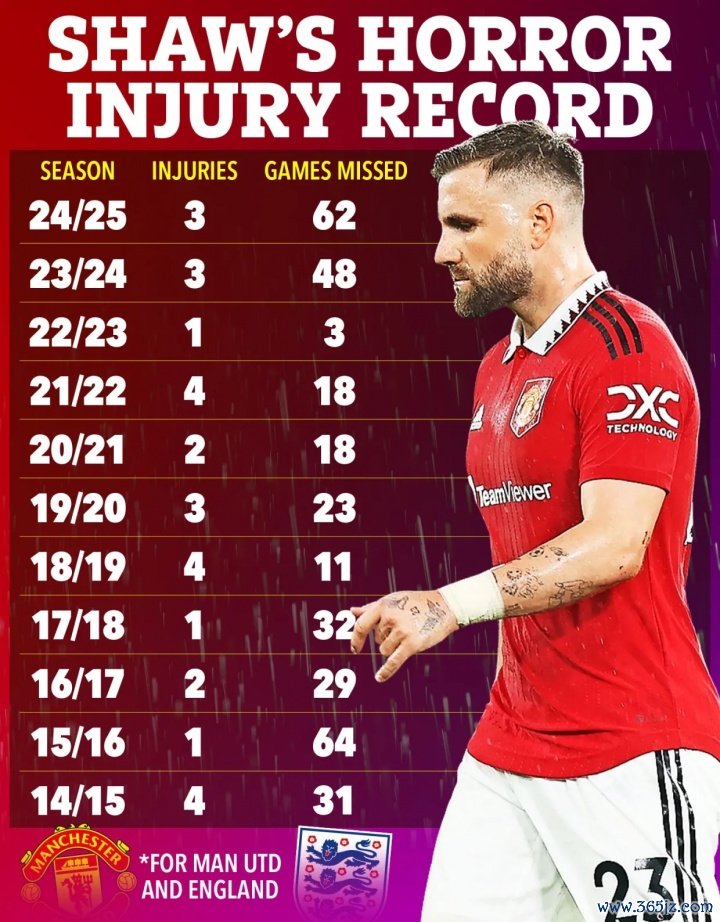 卢克-肖永久饱受伤病困扰,《太阳报》清点了他在曼联的伤病史,11个赛季里,他一共伤缺了339场比赛。上赛季,卢克-肖因小腿受伤,所有只为曼联出战了12场比赛,共计出场时辰不到600分钟。