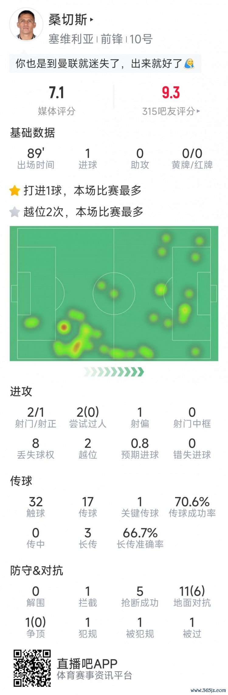 10月6日讯 在本轮西甲,塞维利亚4-1打败巴萨。本场比赛桑切斯靠近旧主破门,以下为他在本场数据: