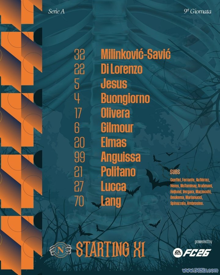 那不勒斯首发:32-瓦尼亚-米林科维奇-萨维奇、22-迪洛伦佐、5-胡安-热苏斯、4-布翁乔尔诺、17-马蒂亚斯-奥利维拉、6-吉尔莫、20-埃尔马斯、99-安古伊萨、21-波利塔诺、27-洛伦佐-卢卡、70-诺阿-朗