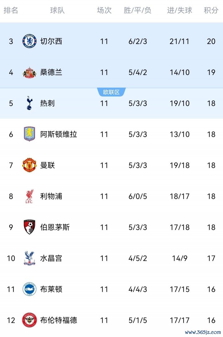 11月10日讯 英超11轮比赛死心,在积分榜上,中上游球队竞争热烈,从第3名的切尔西到第12名的布伦特福德,分差仅有4分。