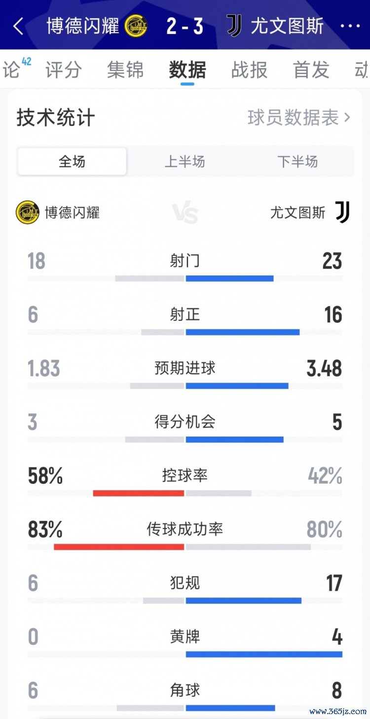 11月26日讯 在本轮欧冠,尤文3-2打败博德能干,以下为两边全场数据对比: