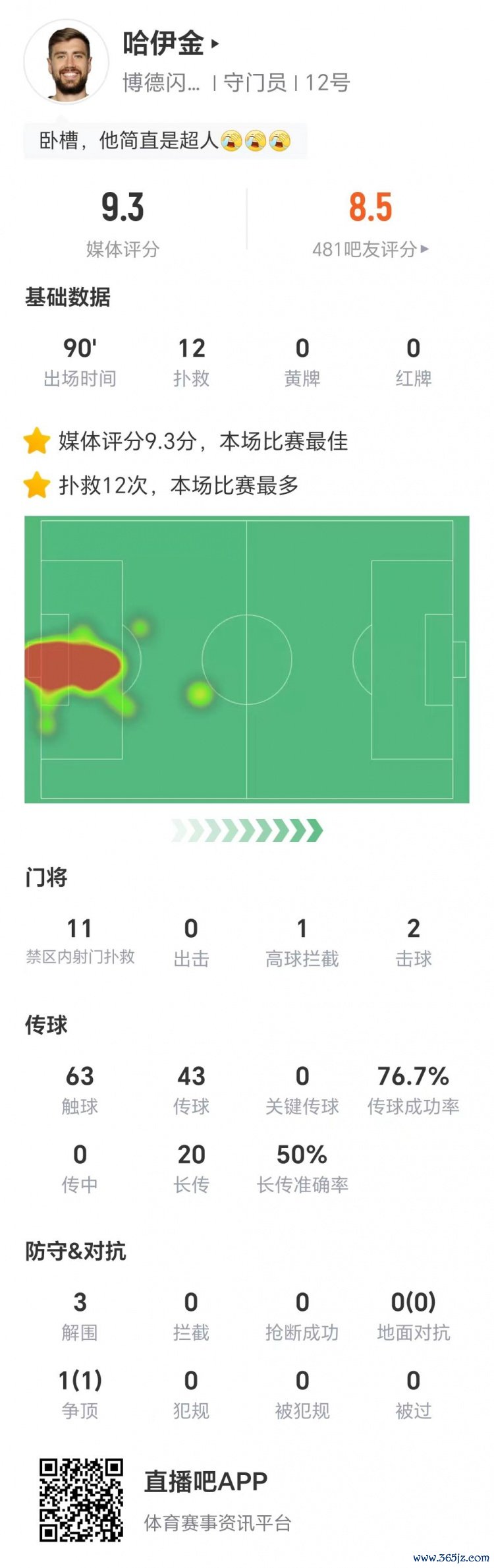 赛后本领统计数据走漏,哈伊金本场比赛共有12次扑救,其中11次齐是面临尤文禁区内的射门。另外,他还有3次突围。