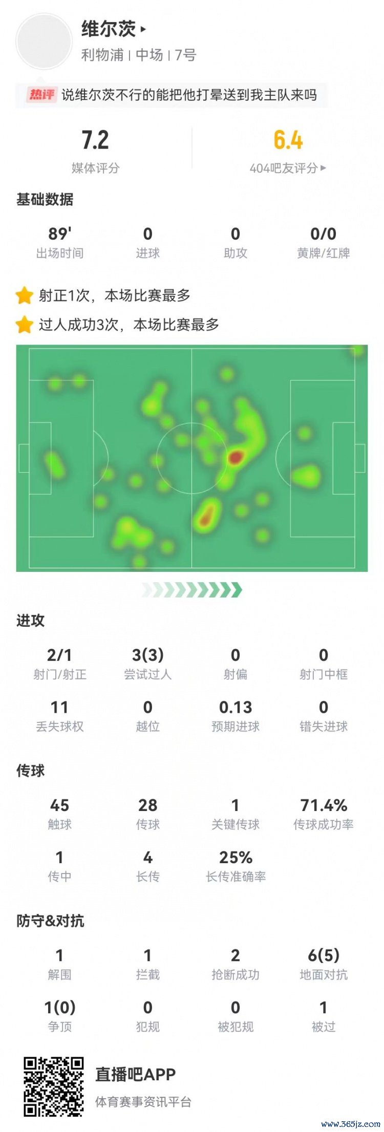 9月1日讯 利物浦在本轮焦点战1-0绝杀阿森纳,维尔茨本场数据如下:
