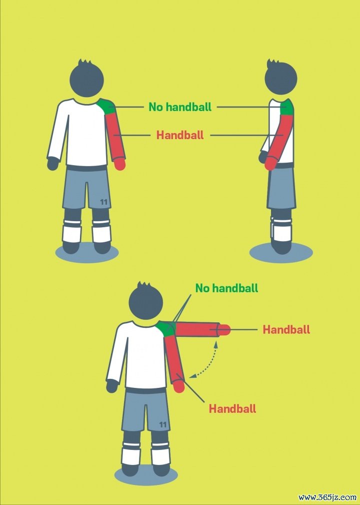 在判定手球犯规时,手臂的上界限以腋窝底部为界。并非球员的手/手臂每次触球王人组成犯规。
