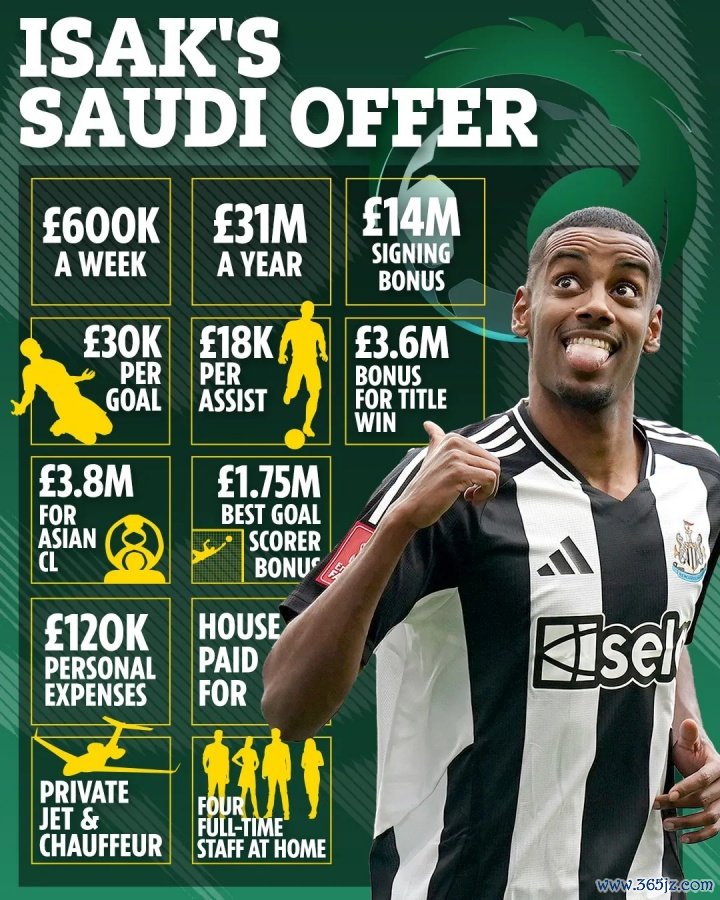 太阳报获悉,在利雅得月牙向伊萨克开出的条约中,要是赢得沙特联冠军,伊萨克将赢得360万英镑奖金;亚冠冠军可获380万英镑;联赛金靴将获175万英镑。