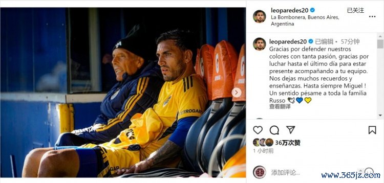 帕雷德斯社媒晒出与鲁索在替补席上的合照,写谈:“感谢您如斯热忱地捍卫咱们的球衣,感谢您激越到临了一天仍与球队并肩。”