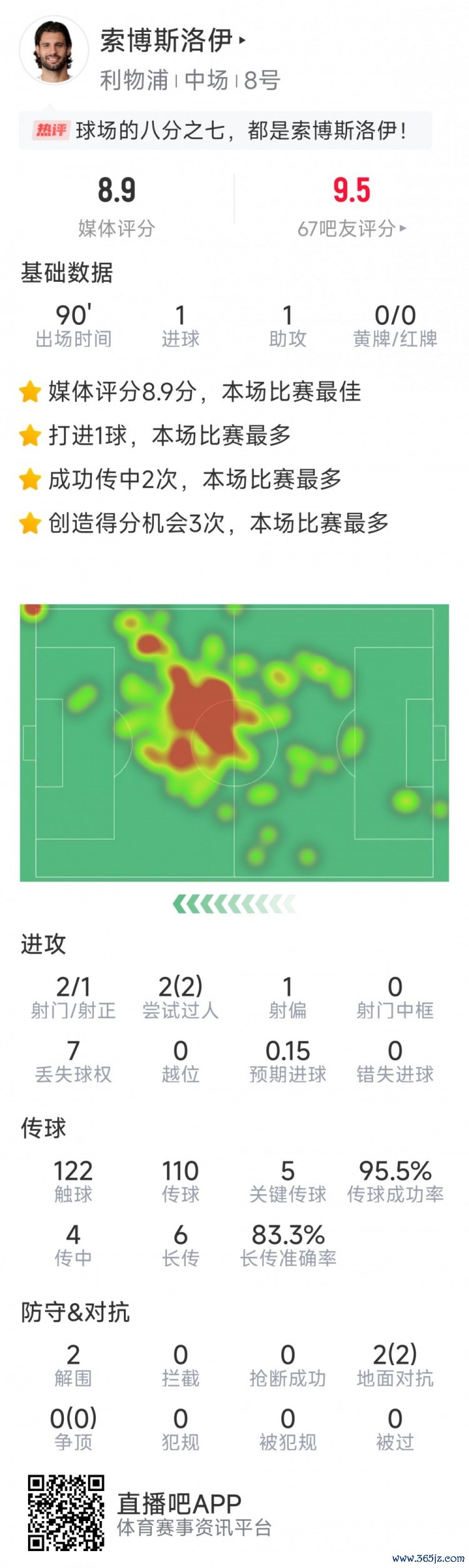 10月23日讯 欧冠第3轮,利物浦客场5-1大捷法兰克福,索博斯洛伊为球队踢满全场,并孝敬传射,当选队内本场最好球员。