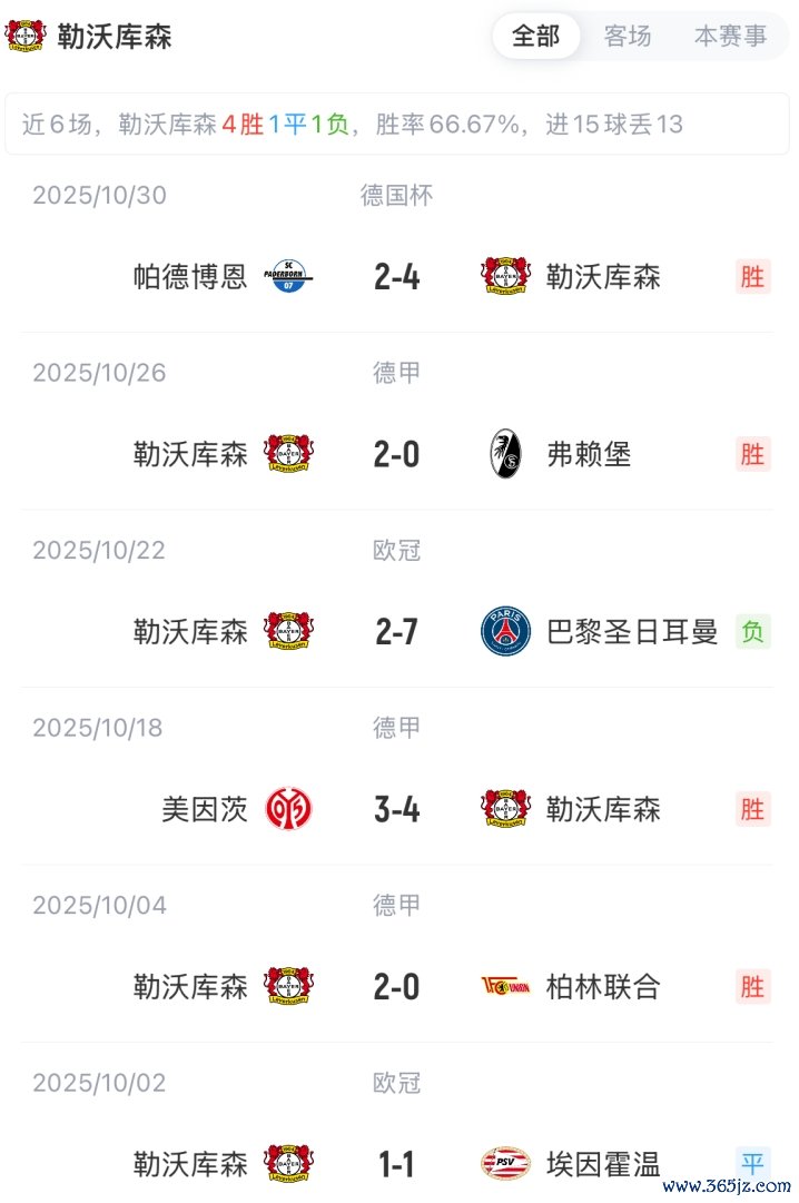 勒沃库森首发:1-弗莱肯、4-宽萨、5-巴代、12-塔普索巴、13-阿图尔、44-贝洛西安、24-阿莱克斯·加西亚、8-安德里希、19-波库、9-埃切维里、14-希克