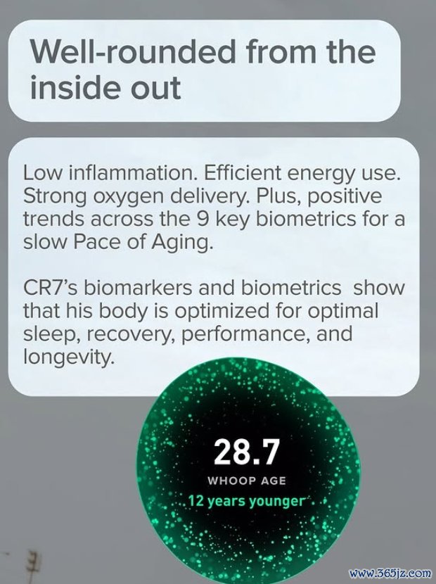 该建树称,C罗是“由内而外的全面健康”:低炎症,高遵循量应用,精深的氧气运输期间。此外,9项关键生物野心均呈现积极趋势,预示着减速软弱。C罗的生物记号物和生物野心浮现,他的身体已达到最好情景,成心于就寝、规复、通顺发达和延伸命命。