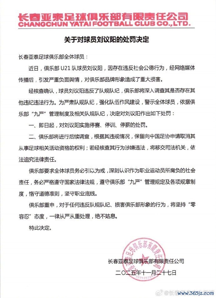 近期,自称是长春亚泰U21后卫刘议阳的女友在多平台发文,称刘议阳出轨、裸聊、拍摄我方玄妙照。今天,亚泰俱乐部防范对刘议阳作出三停惩办。
