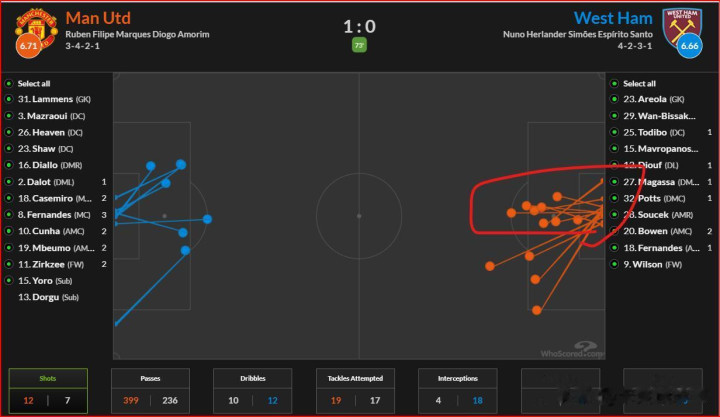 要是你温情曼联的射门位置,你会发现基本都是在中路。曼联这场比赛,即是尝试用传中球来冲击西汉姆,毕竟西汉姆是英超最为发怵传中球的球队之一,而曼联一直进行的传中,也终于抓到了西汉姆的间隙。