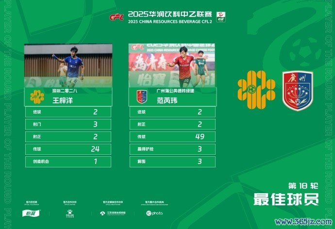 7月28日讯 官方音信,广州蒲公英球员范芮玮和深圳二零二八球员王梓洋当选为中乙第18轮最好球员。