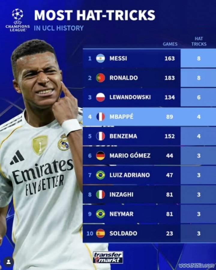 10月1日讯 在本轮欧冠,皇马5-0大捷阿拉木图凯拉特,姆巴佩演出帽子戏法,以下为欧冠历史演出帽子戏法次数榜: