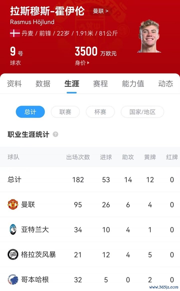 霍伊伦现年22岁,丹麦先锋。曼联在2023年夏天以跨越7500万欧元转会费签下霍伊伦,上赛季球员各赛事出场52次,孝顺10球3助,当前霍伊伦德回身价为3500万欧元。