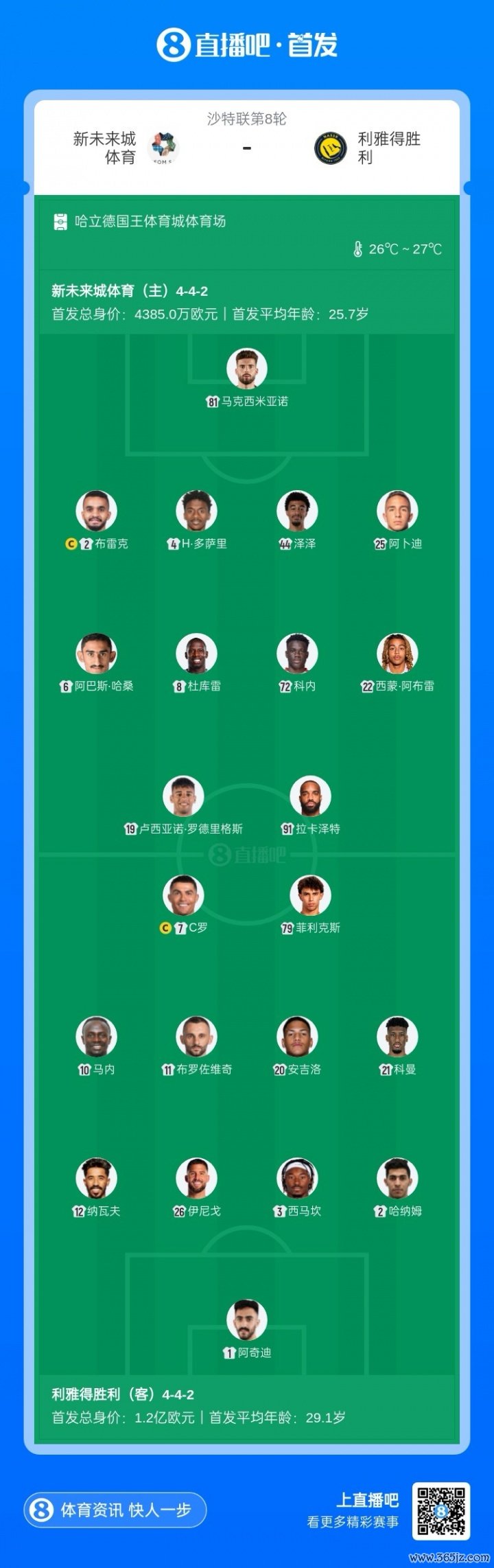 利雅得奏效首发:1-阿奇迪、2-哈纳姆、3-西马坎、26-伊尼戈·马丁内斯、12-纳瓦夫、11-布罗佐维奇、20-安吉洛、79-菲利克斯、21-科曼、10-马内、7-C罗