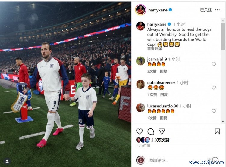 凯恩此役首发出战,匡助英格兰取胜,赛后他在叮咛媒体上晒出携带球员们出场的像片,配文:“在温布利球场携带小伙子们出场耐久是我的荣幸,很欢笑得益胜利,咱们正为寰球杯蕴蓄力量!”